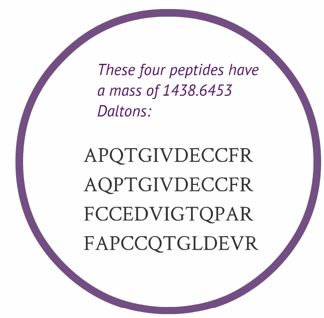 The problem is that peptides with different sequences can have equal masses. For example;