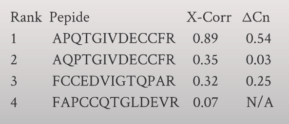 Experimental peptide spectra are matched to simulated spectra from the data using some statistical similarity score (e. correlation coefficient).