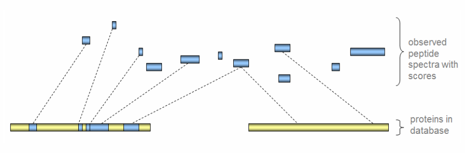So, from one sample we end up with 1,000s of peptides, each with a peptide sequence which it seems to match to. But this is proteomics – we want proteins not peptides. Protein presence is inferred by mapping peptides to the proteins in the reference sequence.