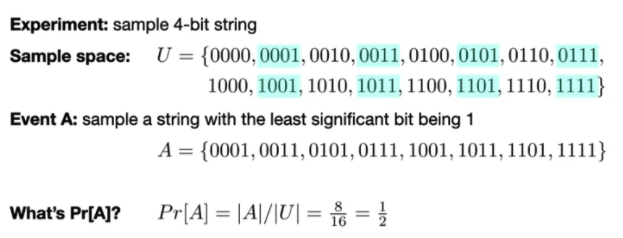 Say again we are sampling a 4-bit binary string. Event A is if we sample a string with the LSB being 1. We also say that each string is equally likely to be sampled.