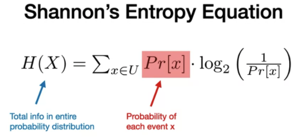 Say we have H(X) where X is some random variable, and it is over all the possible outcomes in the universe. So for each x, we have the probability that event x occurs * log2(1/Pr[x]).