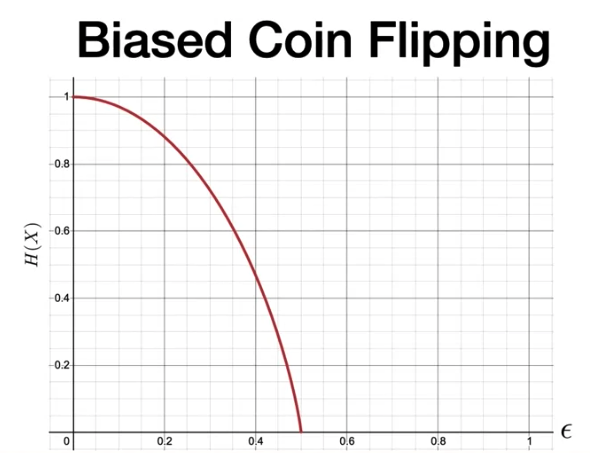 As we increase epsilon, there is less and less entropy because our coin flip becomes more and more guessible. When e becomes as large as it can be (1/2), there is no uncertainty and no entropy.