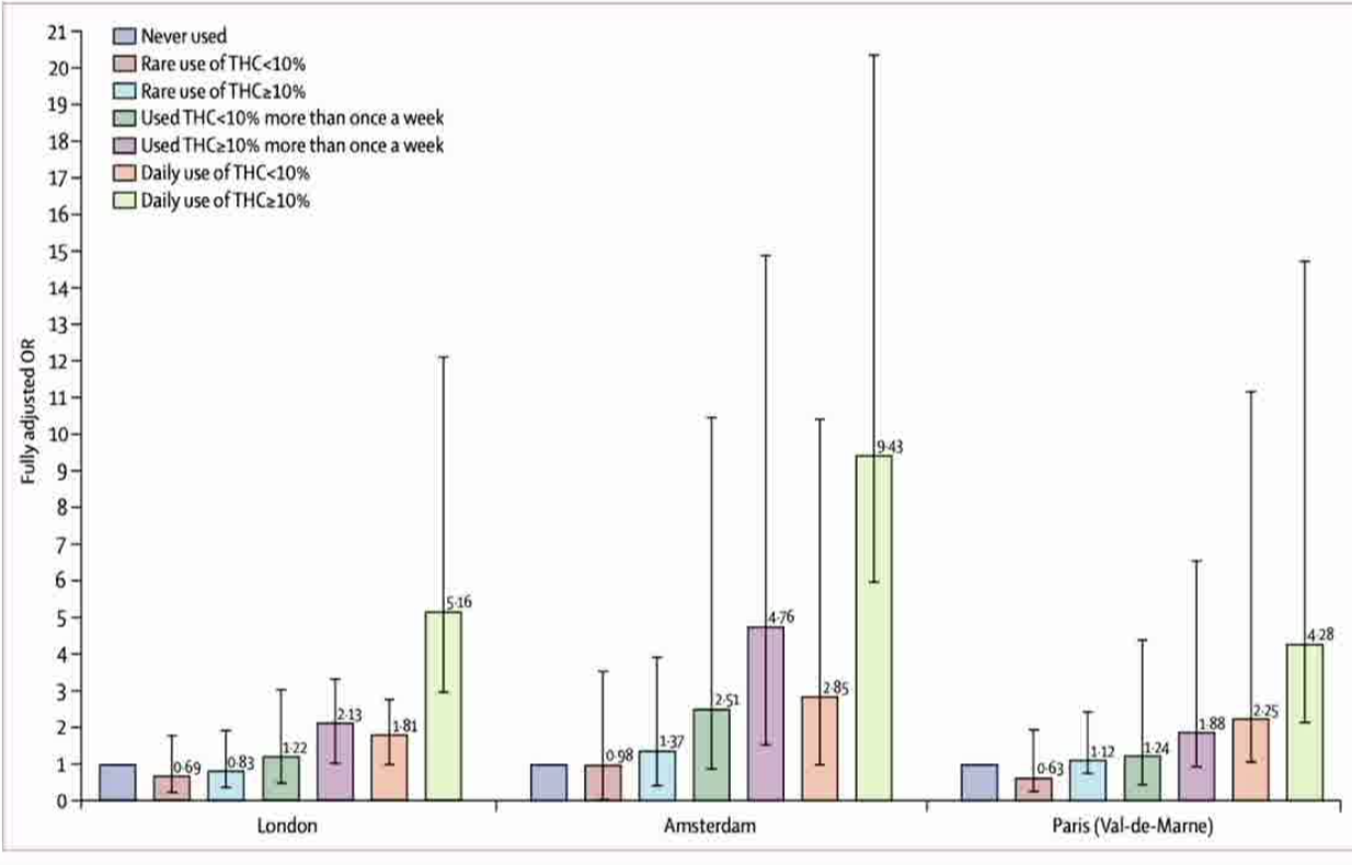 the risk of getting a psychosis is related to the amount of thc and the frequency of use.