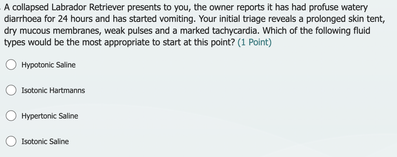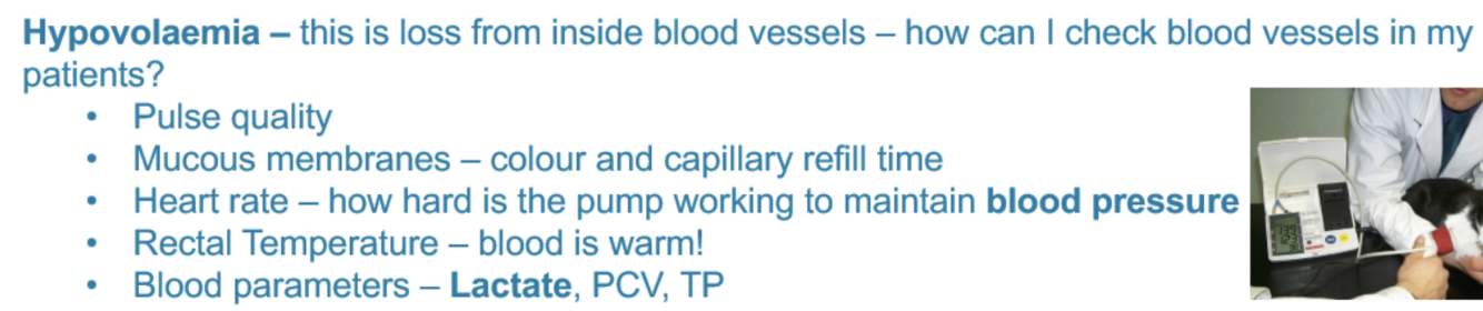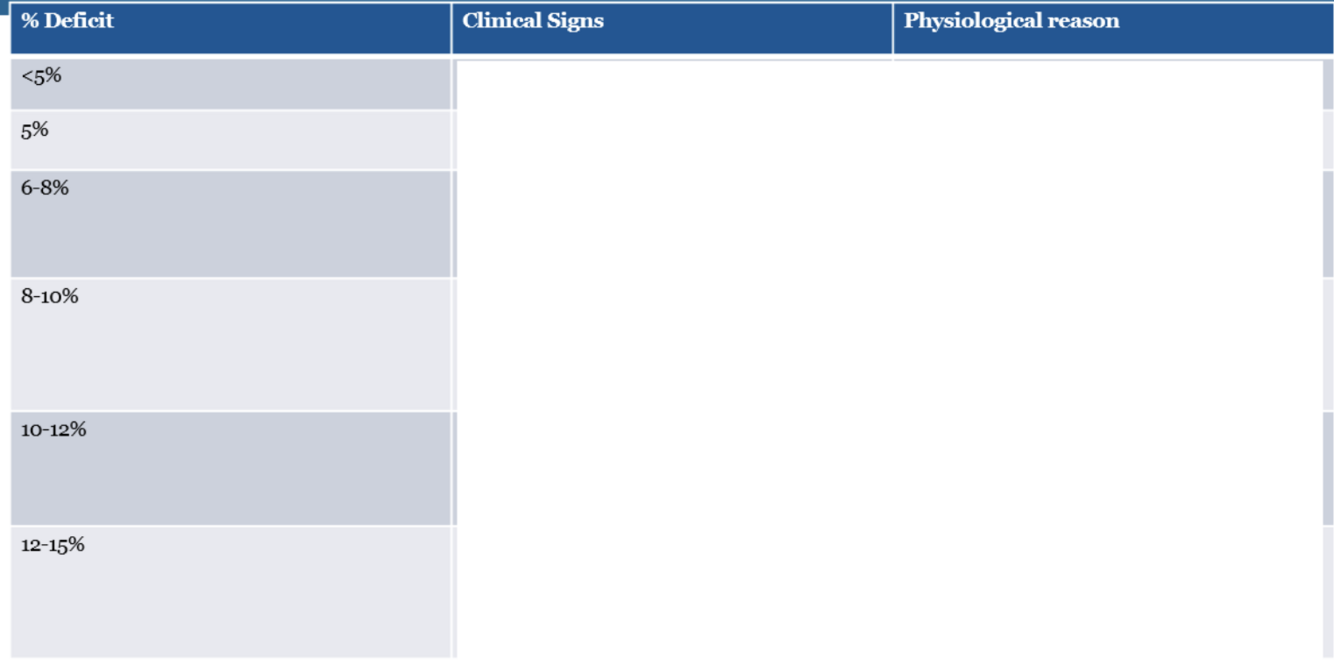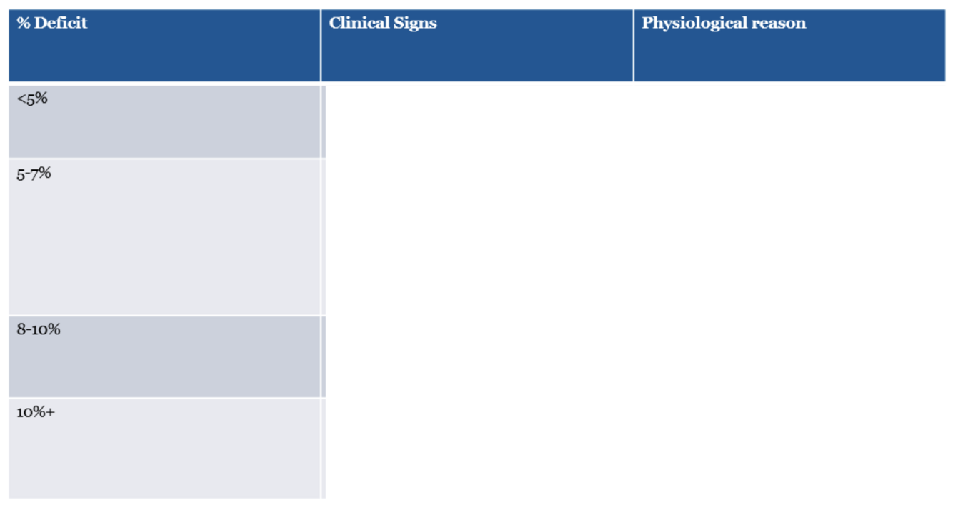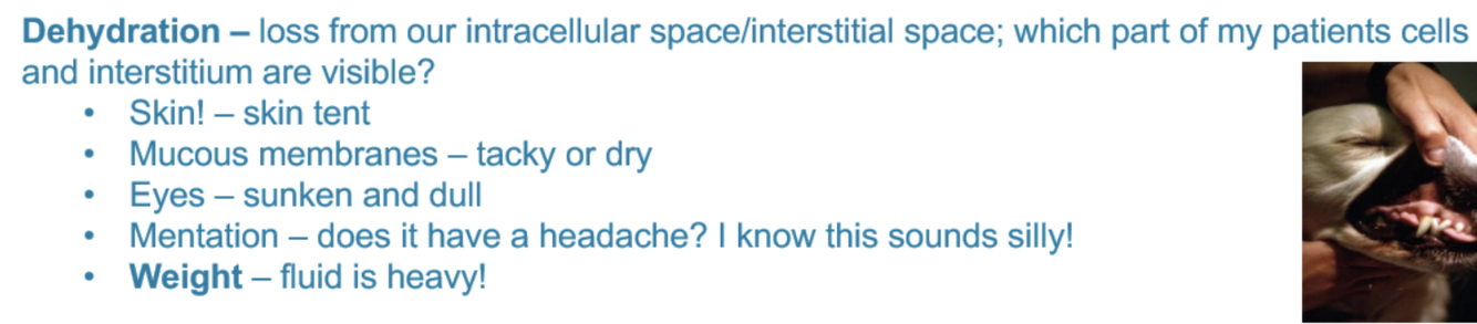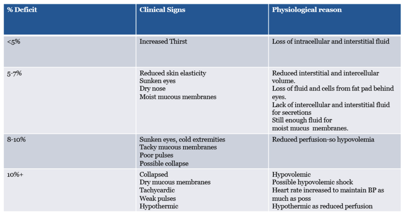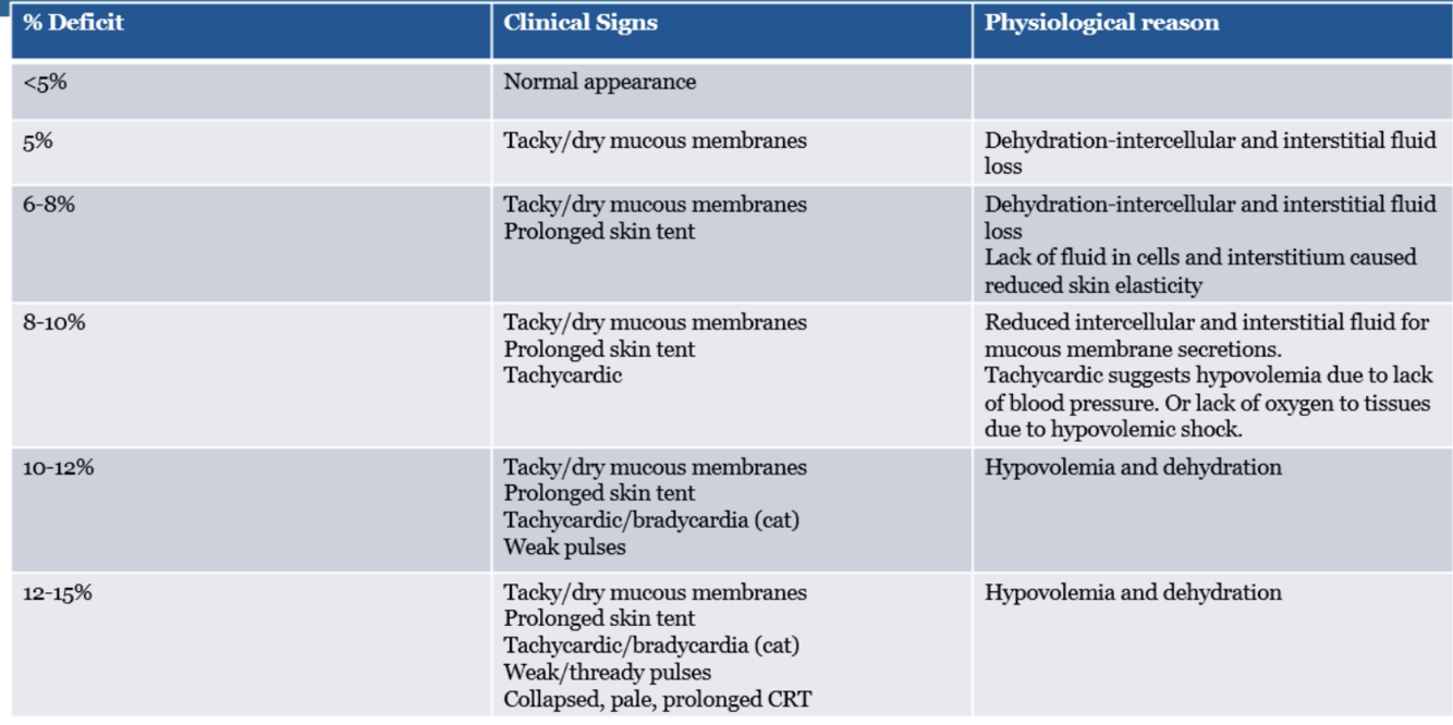 Gives some signs of fluid loss, clinical signs and reason in dog/cat