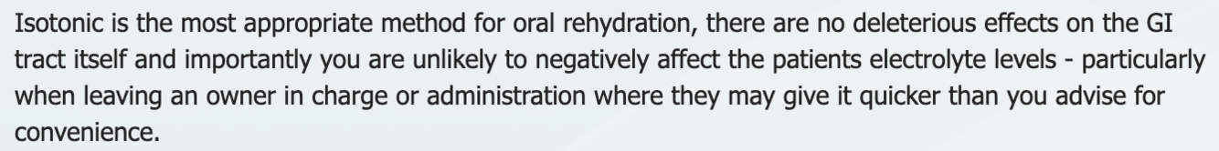 - sodium can be dangerous so only use 1/2x per 24h & always follow with isotonic fluids