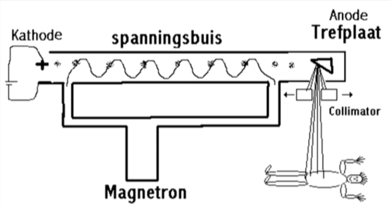 Dus: je maakt een elektrisch veld –> je laat er een spanning in ontstaan –> elektronen komen los (ionisatie) en gaan bewegen van + naar -, dit laat je botsen op een plaatje –> de fotonen die hierbij vrijkomen (met een hele hoge energie) kunnen op weefsel vallen en hier ionisaties maken –> het verschil in absorbatie kun je meten in Gray (J/kg) (1 Gy bestraling = 10.000 ionisaties per cel en geïoniseerde moleculen zijn zeer reactief)