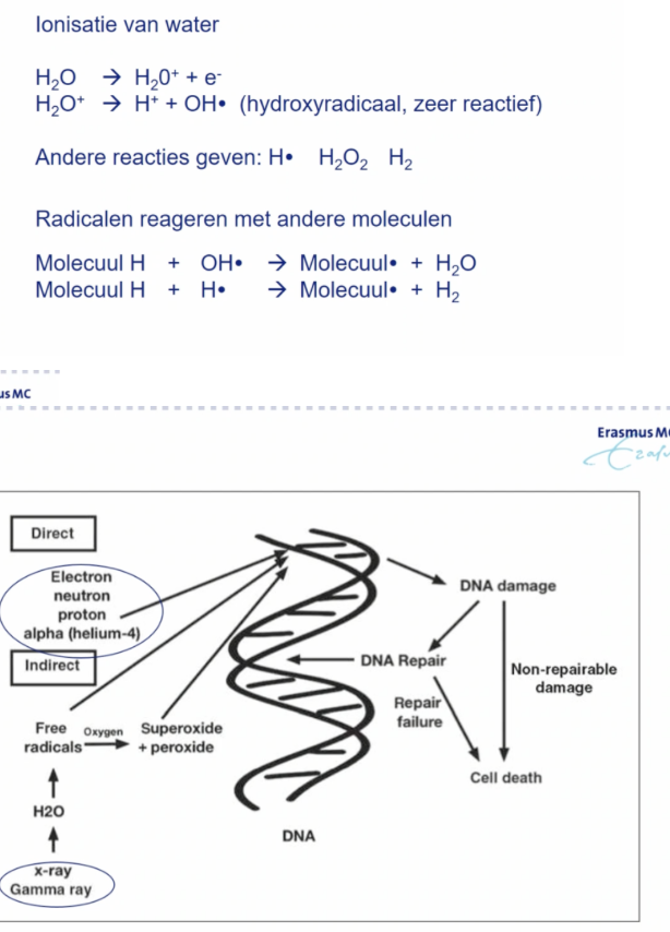 - Indirecte route: ioniserende straling valt op andere atomen waardoor vrije radicalen ontstaan die DNA-schade veroorzaken en wat leidt tot celdood (groot aandeel)