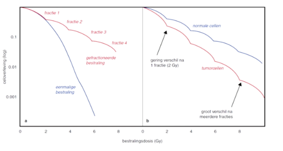 - bij eenmalige bestralingsdosis van 6 Gy amper celoverleving, maar bij gefractioneerde bestraling van 6 Gy celoverleving hoger (cellen herstellen rond de fracties, niet te lang interval want dan herstellen maligne cellen ook)