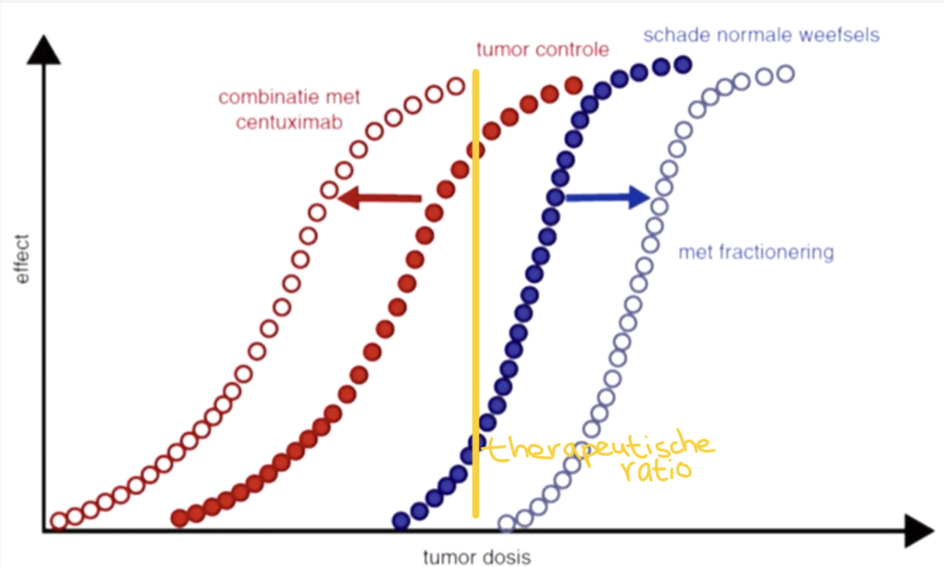 Verschil tussen effectieve en toxische dosis: balans tussen het dood maken van tumorcellen en het dood maken van normale cellen –> je moet ergens tussenin gaan zitten, anders dan heeft je behandeling niet het gewenste resultaat (tumorcellen dood, normale cellen levend)