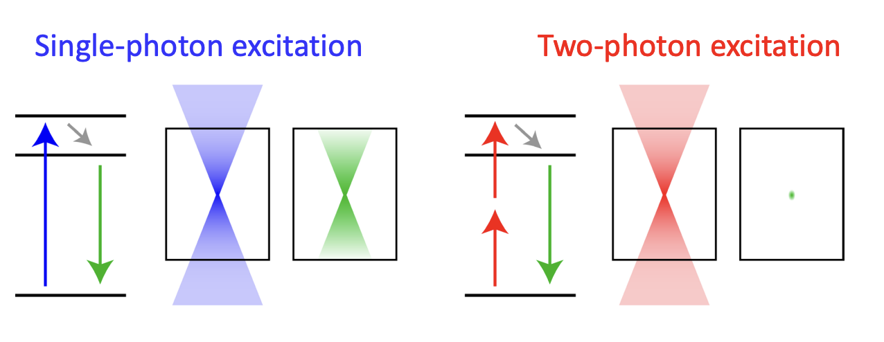 - can work in vivo, probably requires two-photon excitation for same reasons as optical imaging