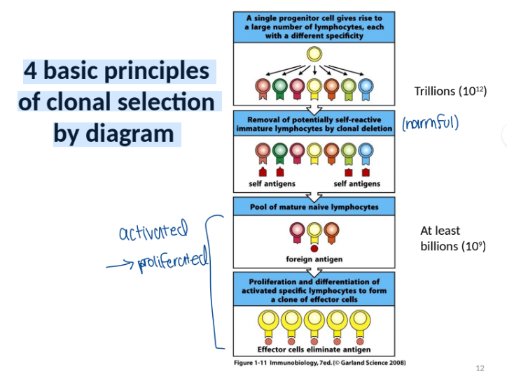 4 basic principles of clonal selection = makes immune system capable of specificity