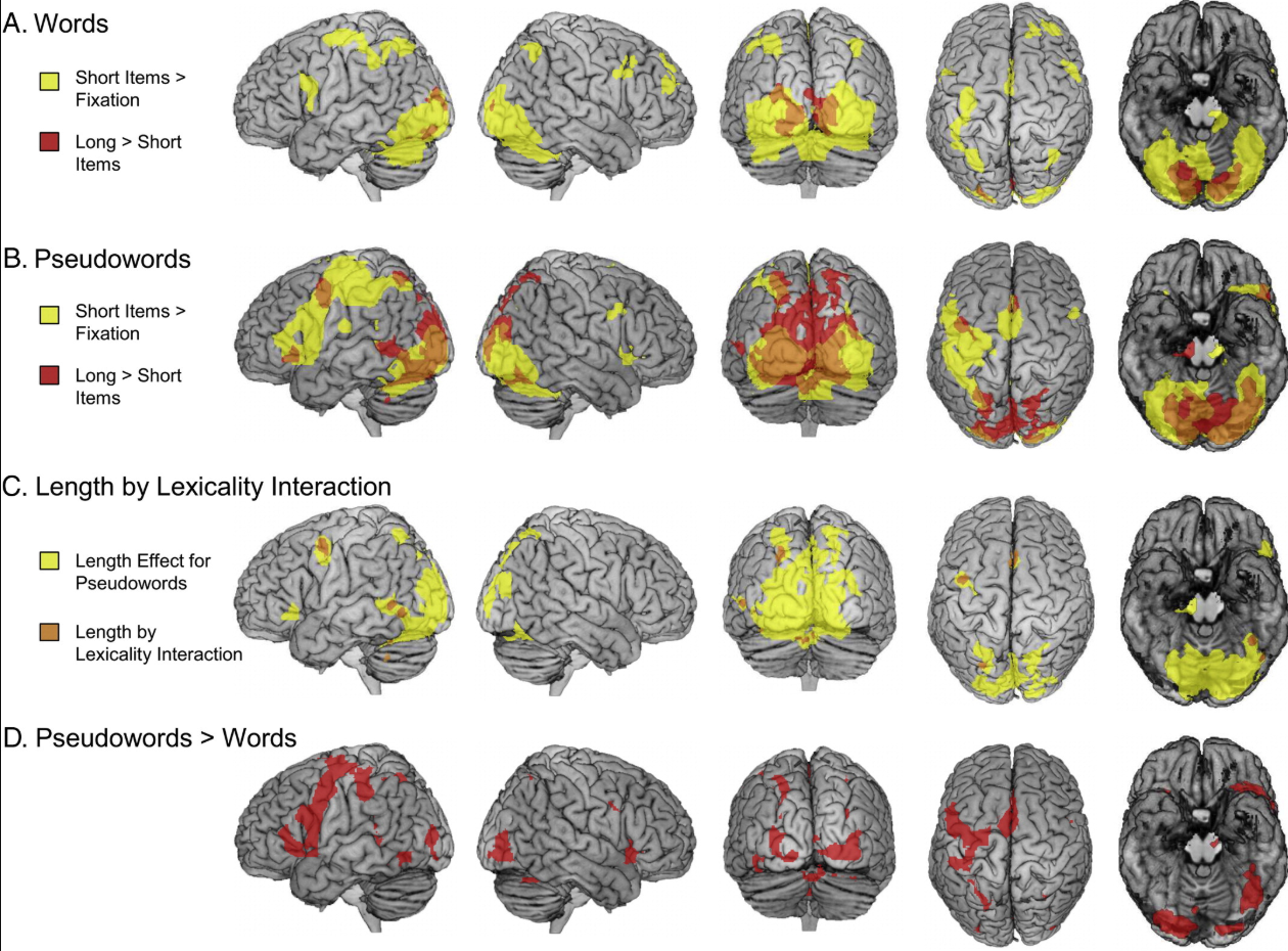 Another study by Schurz, Sturm, Richland, Kronbichler, Ladurner, & Wimmer (2010), looked at word length effect with pseudowords (follows rules of language) and real words: