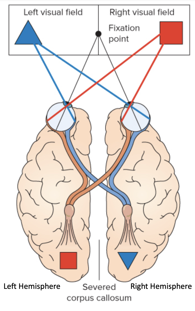 Visual information sent to the two different hemispheres. Face in right filed of view will go to left brain hemisphere which is specialized for language so patient can say they saw the word face and verbalize it in contrast if they see face on left field of view it will be sent to right hemisphere and patient cannot indicate the word that they saw since right is not speicalzed for language and there is no cross talk. If they instead were asked to draw the key is they are given pen on side of body that corresponds to hemspiehre of brain where info is sent so info is sent to right hemisphere which controls left side of body so cannot verbalize it but can draw it