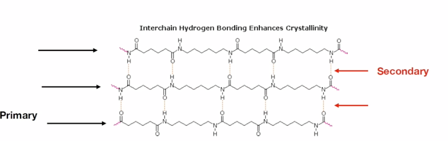In these type of polymers, the repeating units are joined end to end. There may also be extensive van der Waals and hydrogen bonding between chains