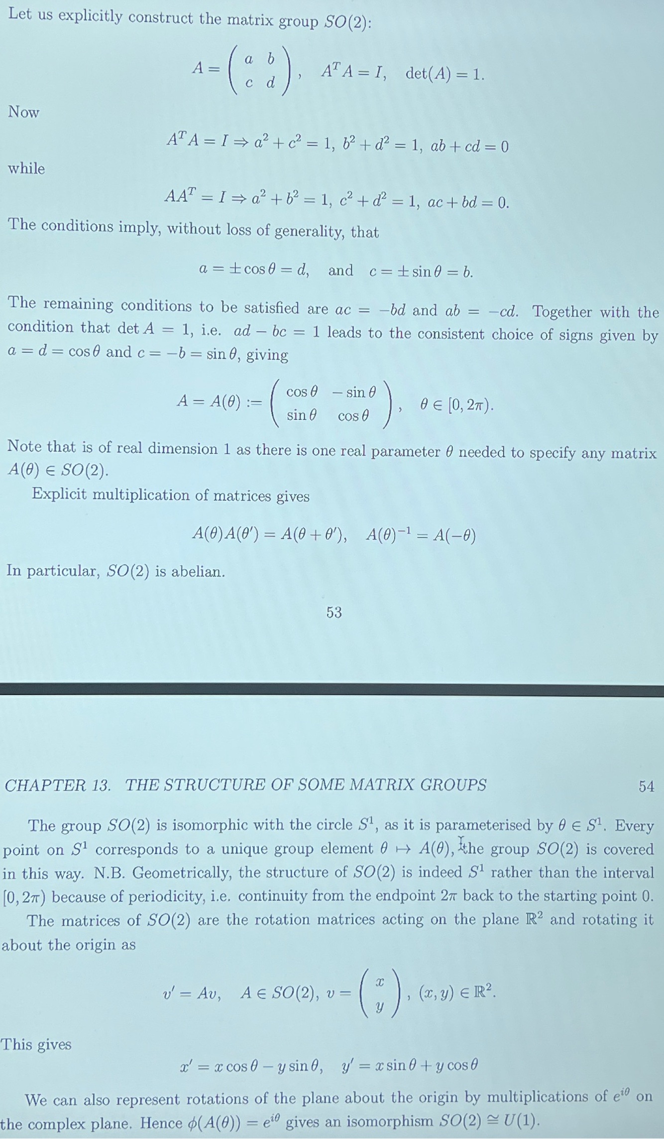 Construct SO(2) then show that it’s isomorphic to S^1 and to U(1)