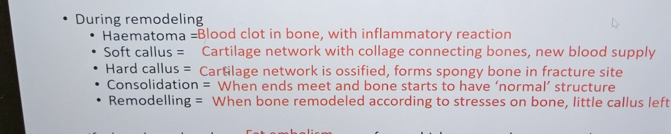What happens during the 5 stages of fracture remodeling ?