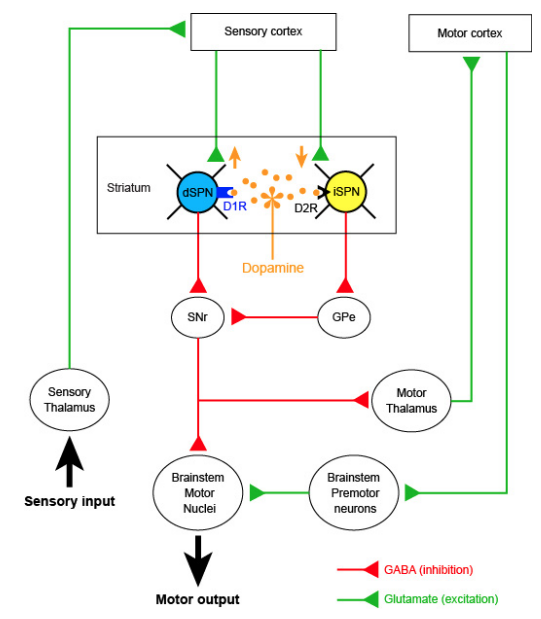 - weakens the inhibitory “indirect striatopallidal pathway”