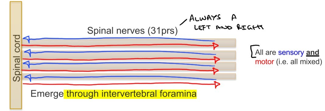 How many Spinal Nerves are there? Explain the sensory and motor makeup of these nerves. Where do they emerge from?