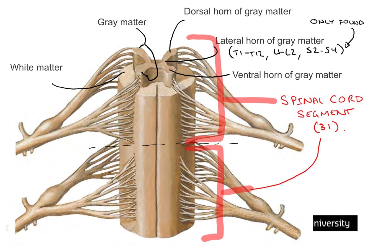 Explain the composition of the white matter to gray matter in the SPINAL CORD. where are the dorsal and ventral horns? There is also another horn present in some spinal cord segments, what is this known as and what segments is it present in?