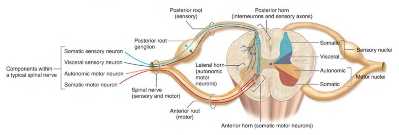 Sensory components enter the spinal cord via Dorsal spinal nerve root. Motor components exit the spinal cord via Ventral nerve root. They join to produce Mixed spinal nerve.