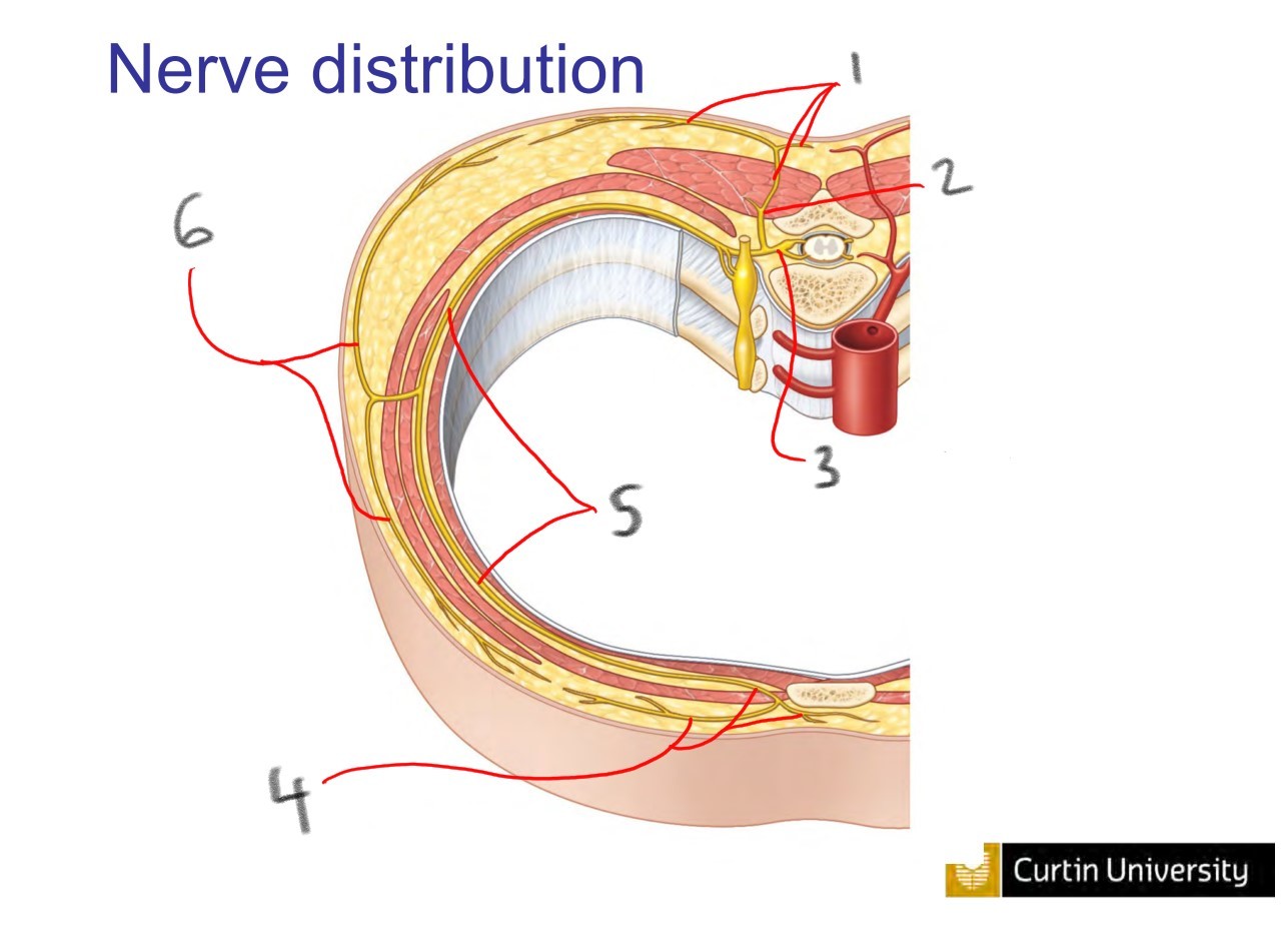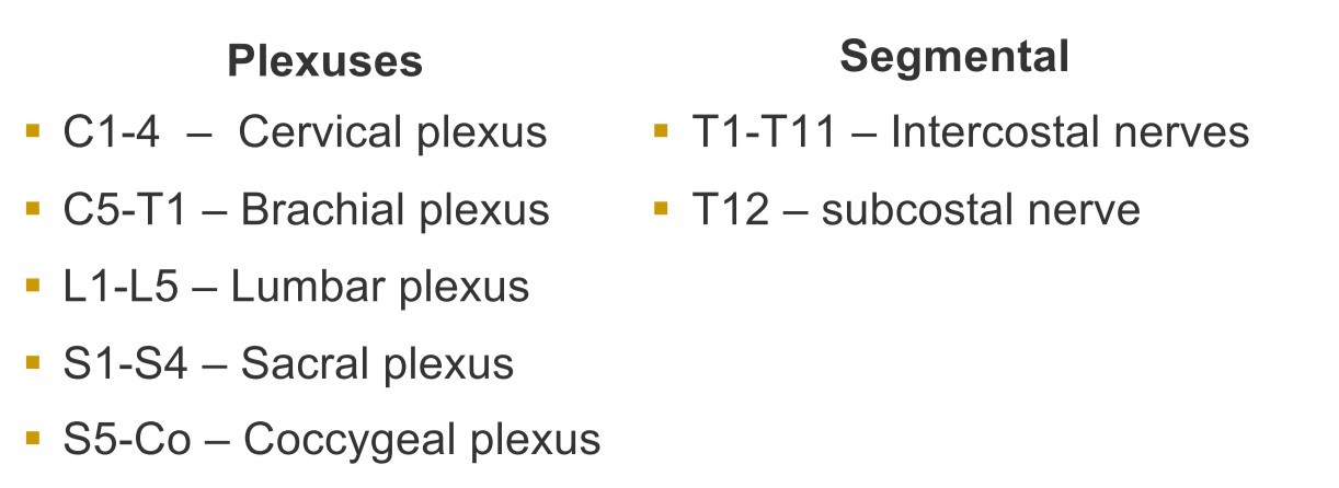 One spinal cord segment supplies one area, this means that the nerve has contributions from only one spinal cord segment. It follows the segmental pattern of development and is usually involved in Simple movments (unlike muscles of the upper limb for example that require integrated plexuses to achieve more complicated shit).