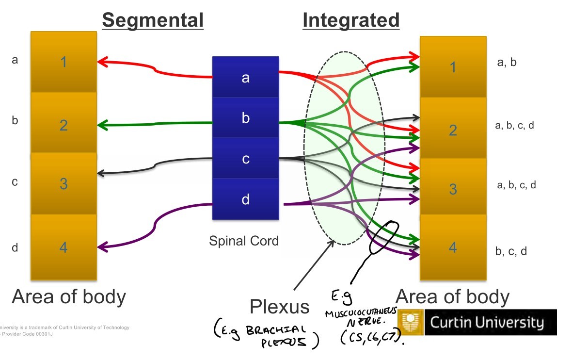 It is when a number of spinal cord segments supply an area in order to achieve complex coordinated muscle activity. A plexus is the most common example as we have two very common plexuses known as the lumbosacral plexus and the brachial plexus (there are more) that are responsible for the mojority of upper and lower limb movements. Instead of refering to the nerves by the segments, for integrated supplies we usually name the nerve by what its innervating to avoid having to name each root segment involved; i.e. the Musculocutaneous nerve from the brachial plexus which involves nerves C5,C6, and C7.