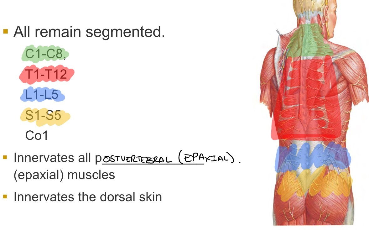 Innervate all postvertebral (epaxial) muscles as well as the dorsal skin.