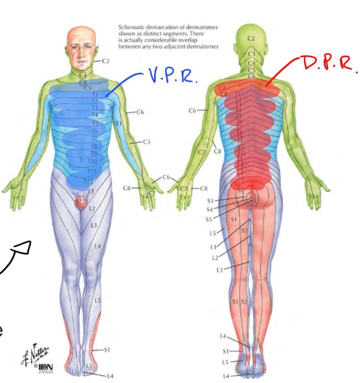 E.g. The Single Spinal nerve of S1 will innervate the skin of the medial portion of the entire length of the posterior thigh, then the lateral portion of the calve and then the lateral foot including the 5th digit as it heads inferiorly.