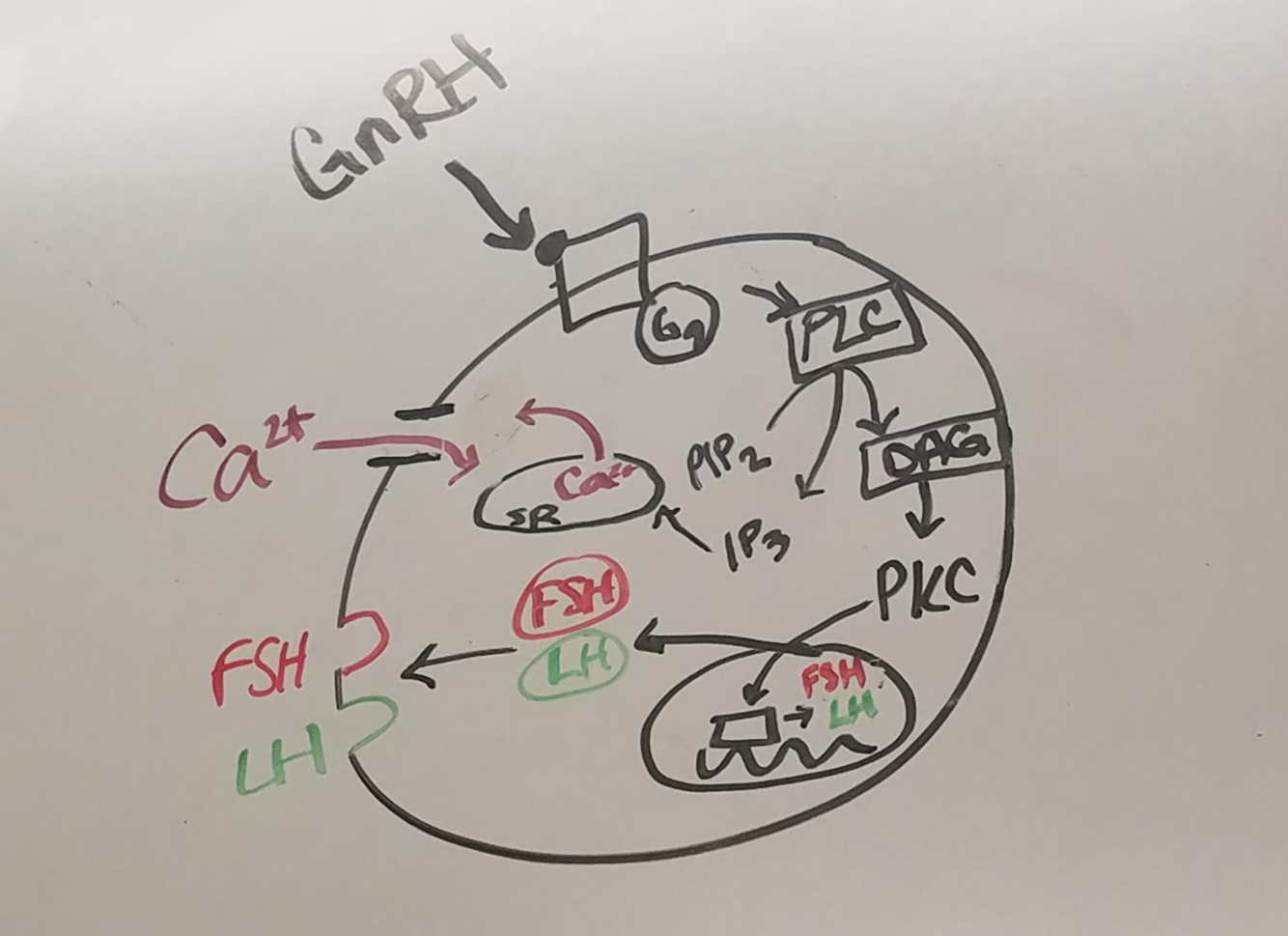 GnRH binds to g-protein coupled receptor, Alpha q subunit will activiate PLC causing Pip2 to differentiate into IP3 and DAG. DAG activates PKC, which will bind to transcription factor in nucleus and activates transcription of FSH and LH, they will be translated in ER and finished in golgi where they wait to be excreted. At same time IP3 will bind to SR which will release Ca into cytoplasm and then causes influx of extracellular Ca into cell, the increase in Ca intracellularly will cause the release of FSH and LH in vessicles through exocytosis