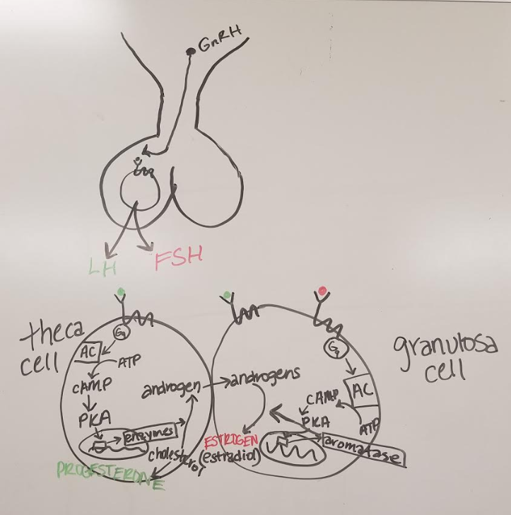 LH binds to theca cell on g-protein coupled receptor (GPCR). The Alpha-s subunit of GPCR activates adenyl cyclase, which will convert ATP to cAMP. cAMP will activate PKA which will bind to transcription factor of DNA in nucleus to transcribe enzymes. The enzymes will finish transcription, be translated in ER and finished in golgi. Finished enzymes will then be used to convert cholesterol into androgen and progesterone. Androgen will be sent to granulosa cell.