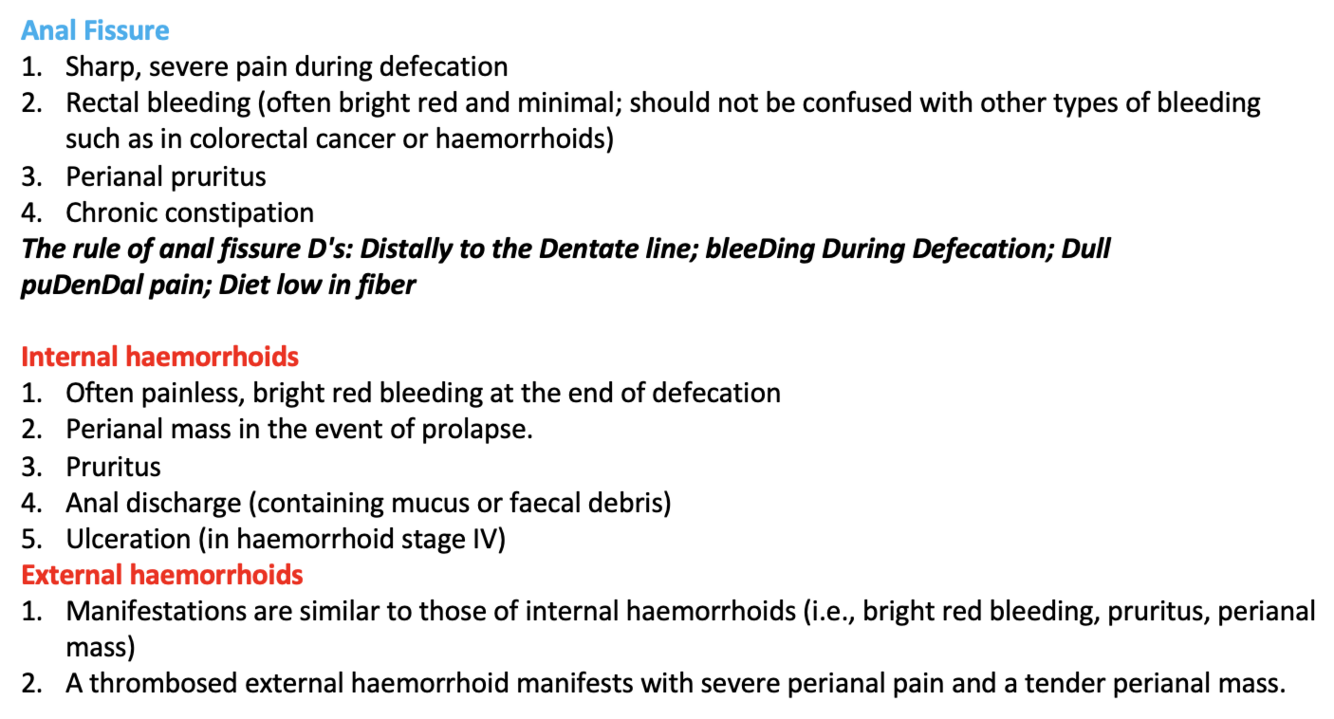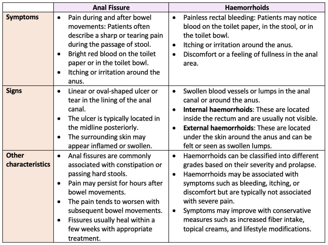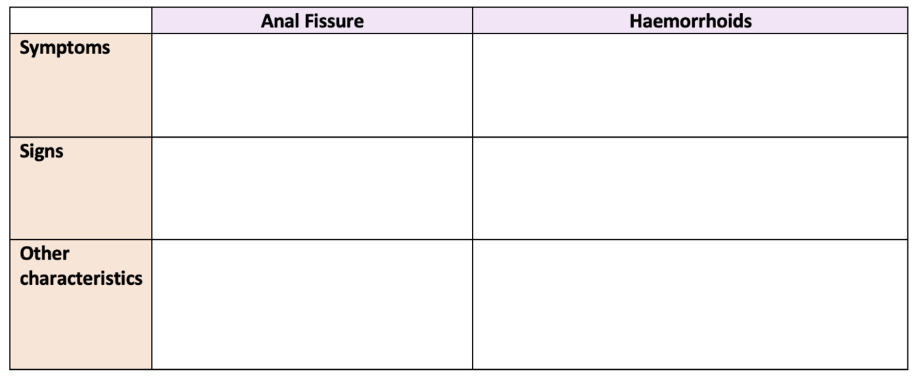 Compare and contrast the symptoms and signs of anal fissure and haemorrhoids.