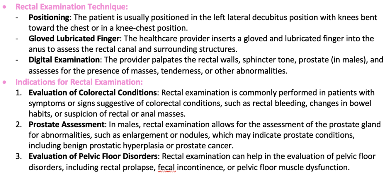 Rectal examination is a physical examination technique used to assess the rectum and adjacent structures for the presence of abnormalities or disease. It is an important component of a comprehensive clinical assessment and can provide valuable information in the diagnosis and management of various conditions.