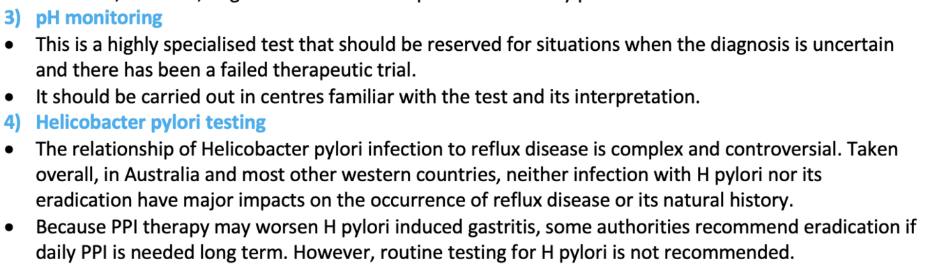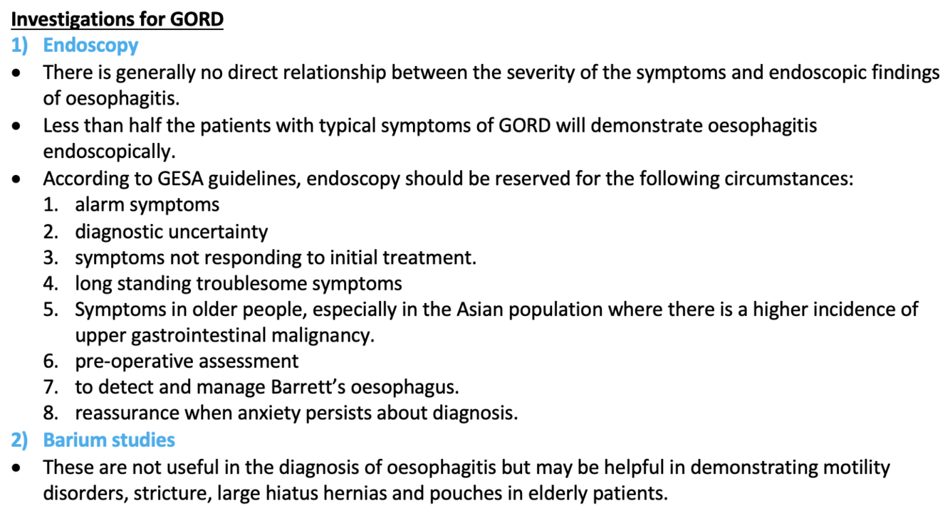 List 4 possible investigations for GORD?