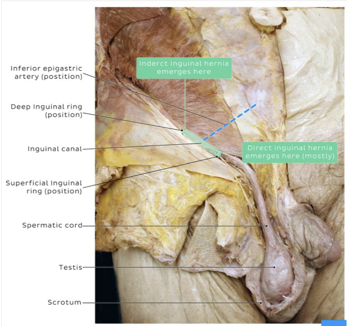 - Found above the midpoint of the inguinal ligament (lateral to the epigastric vessels).