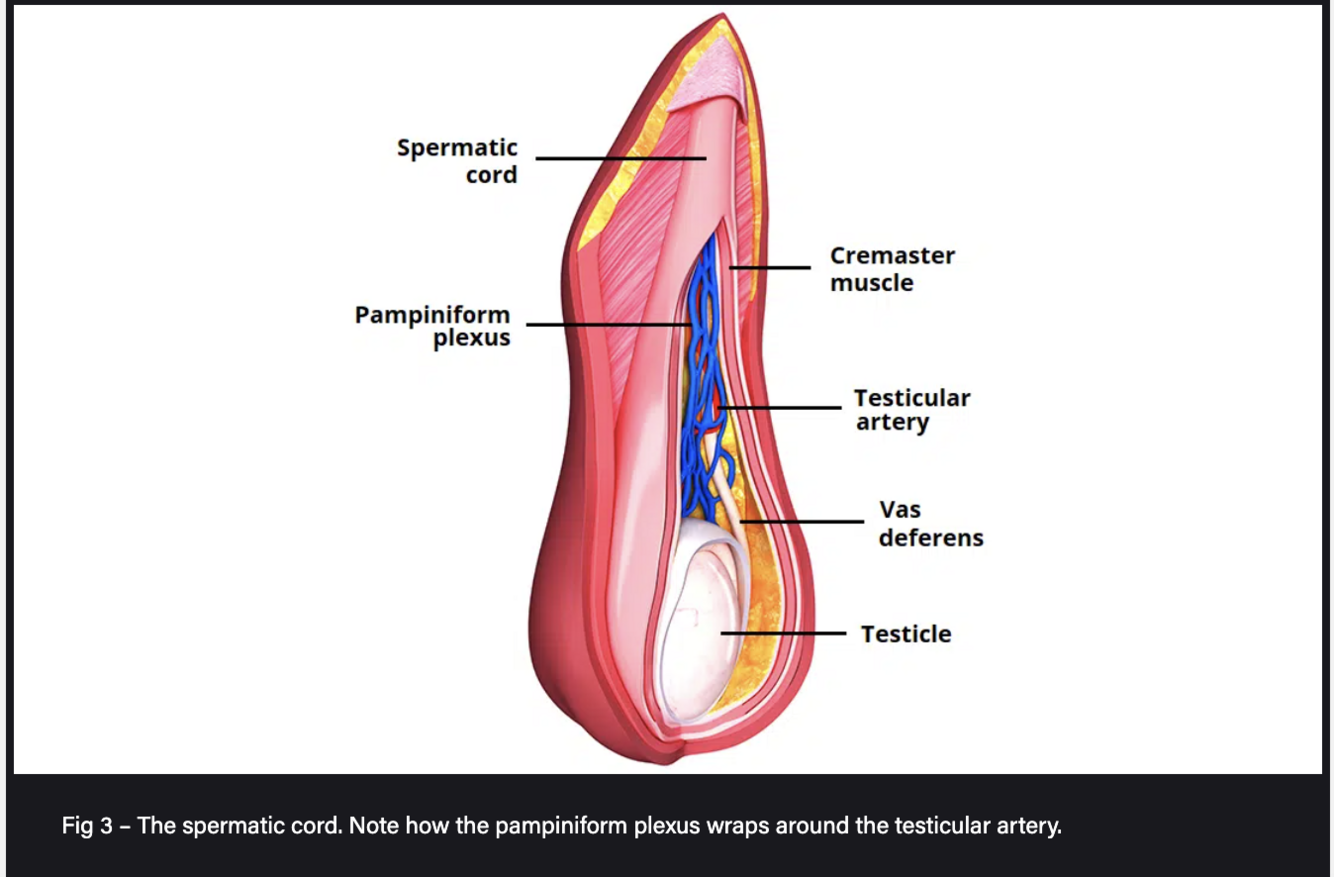4. Pampiniform plexus of testicular veins – drains venous blood from the testes into the testicular vein.