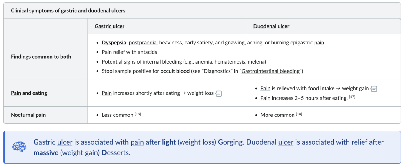 Compare and contrast gastric and duodenal ulcers in terms of pathophysiology, symptoms, and complications.