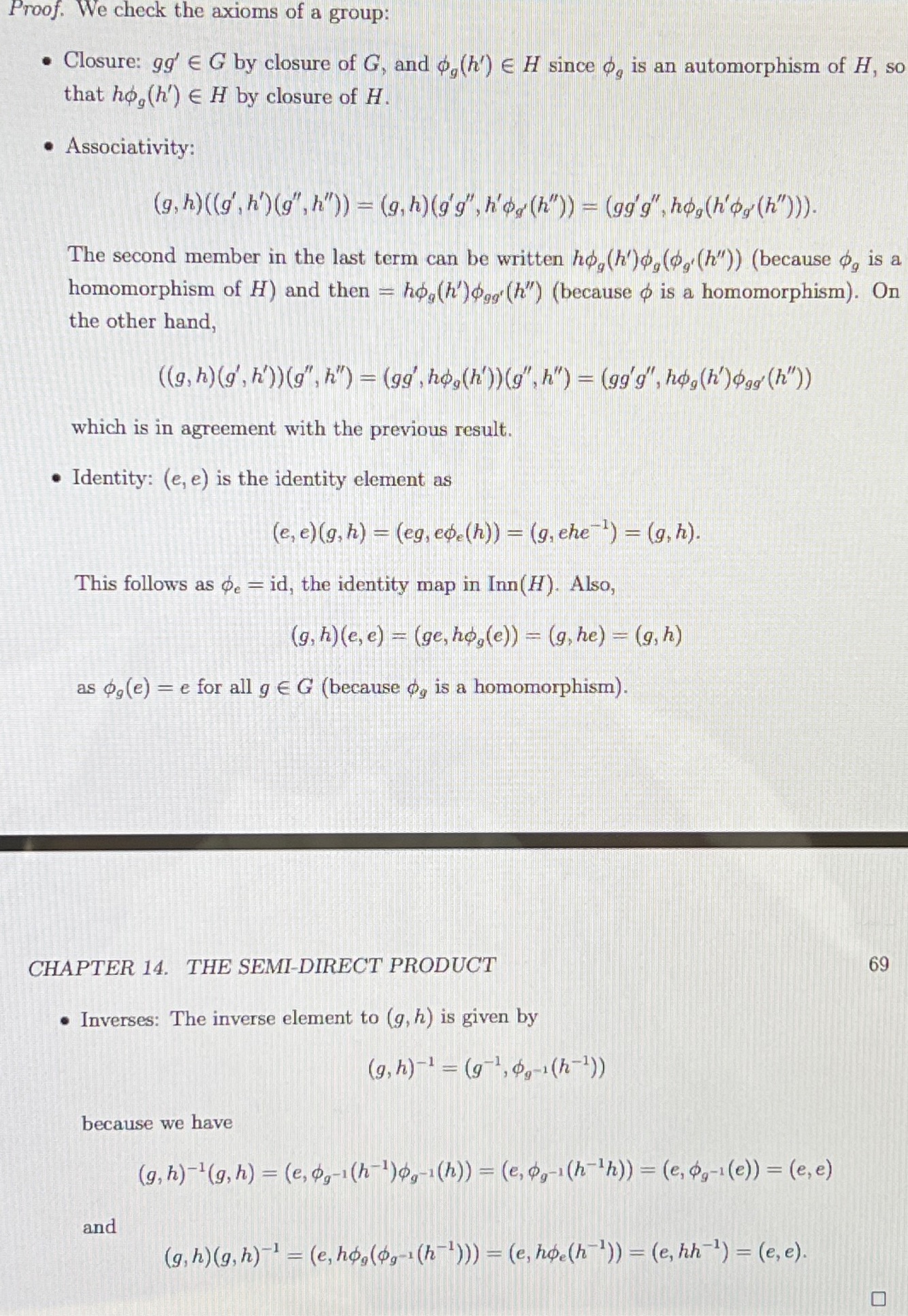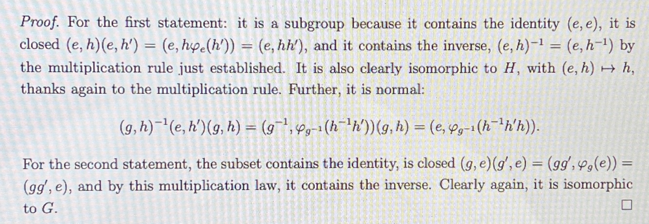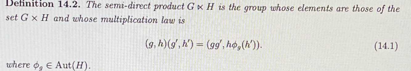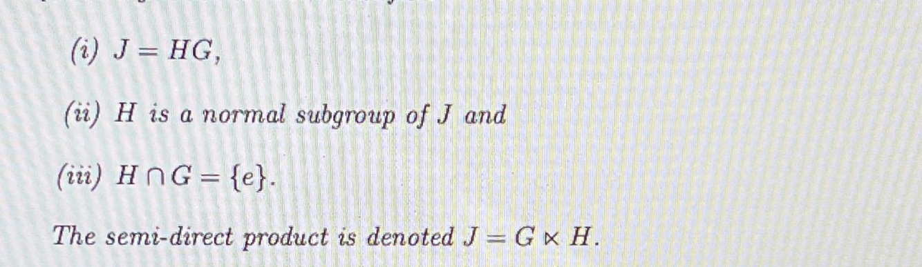 A group J is a semi direct product of a subgroup H by a subgroup G is the following conditions are satisfied