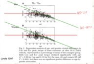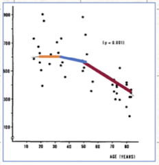 - begins at age 30, gradual 30-50, 30% loss from 50-80
