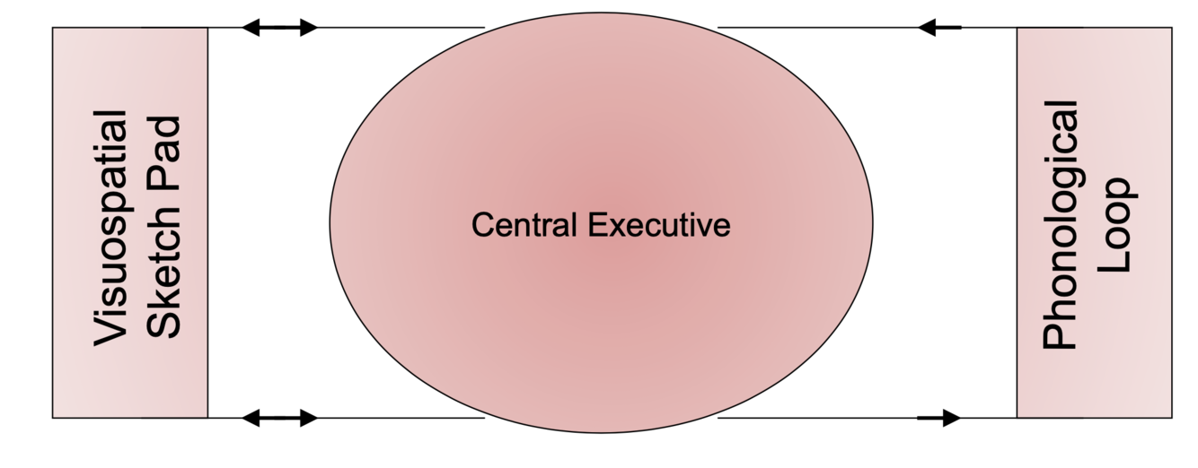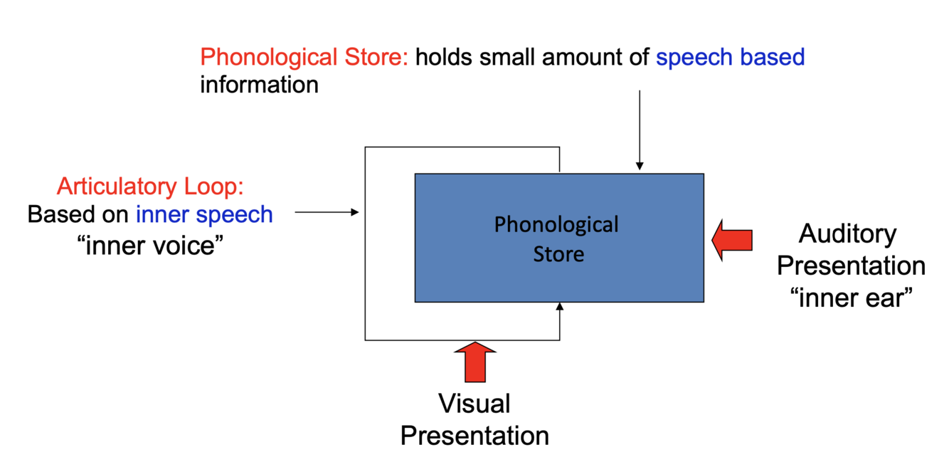 phonological loop can only process speech based info. So auditory info presented it can go directly to phonological whereas visual needs to go through articulacy loop. Going to have to rehears info in inner voice and transfer visual info to acoustic info in order to get into phonological store.