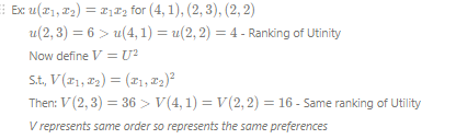 A monotonic transformation of a utility function → utility fuction that represents same preferences as original utility function.