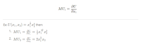 Marginal Utility of commodity i rate of change of totel utility as the quantity of commodity i is comsumed changes