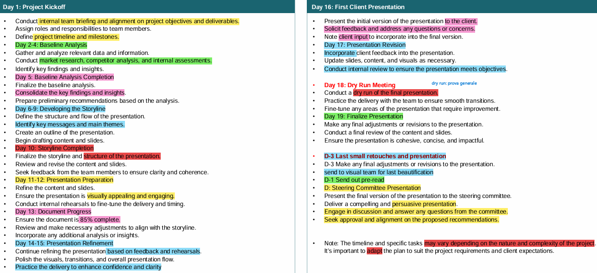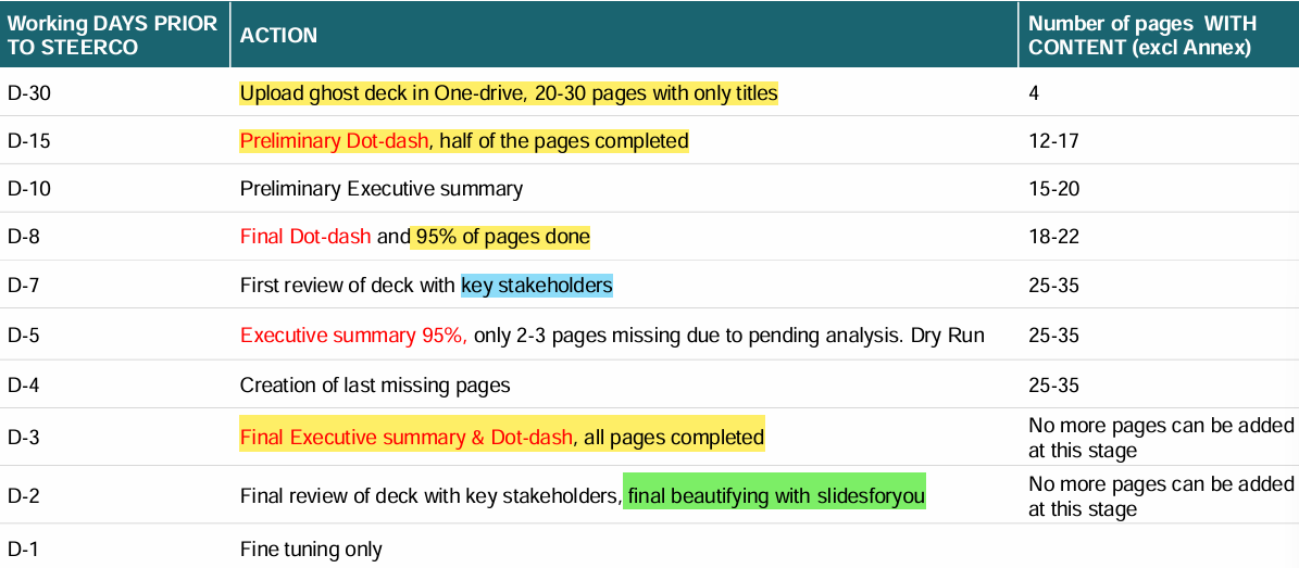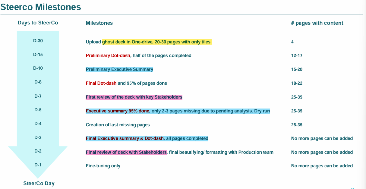 list what has to be completed day by day prior to steerco?D-30, D-15, D-10, D-8, D-7, D-5,D-4, D-3, D-2, D-1 and D