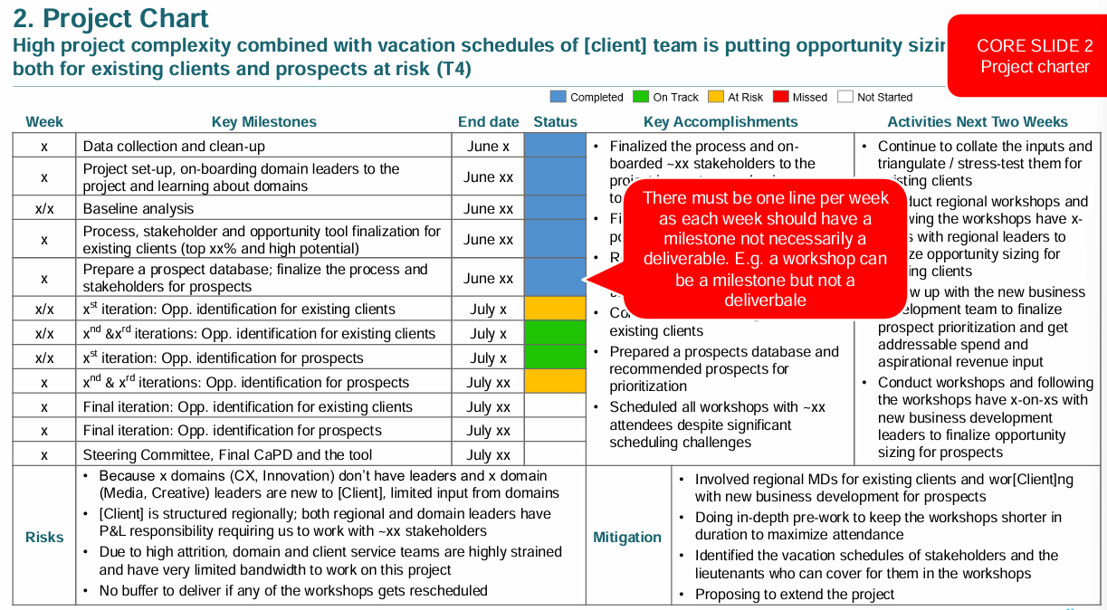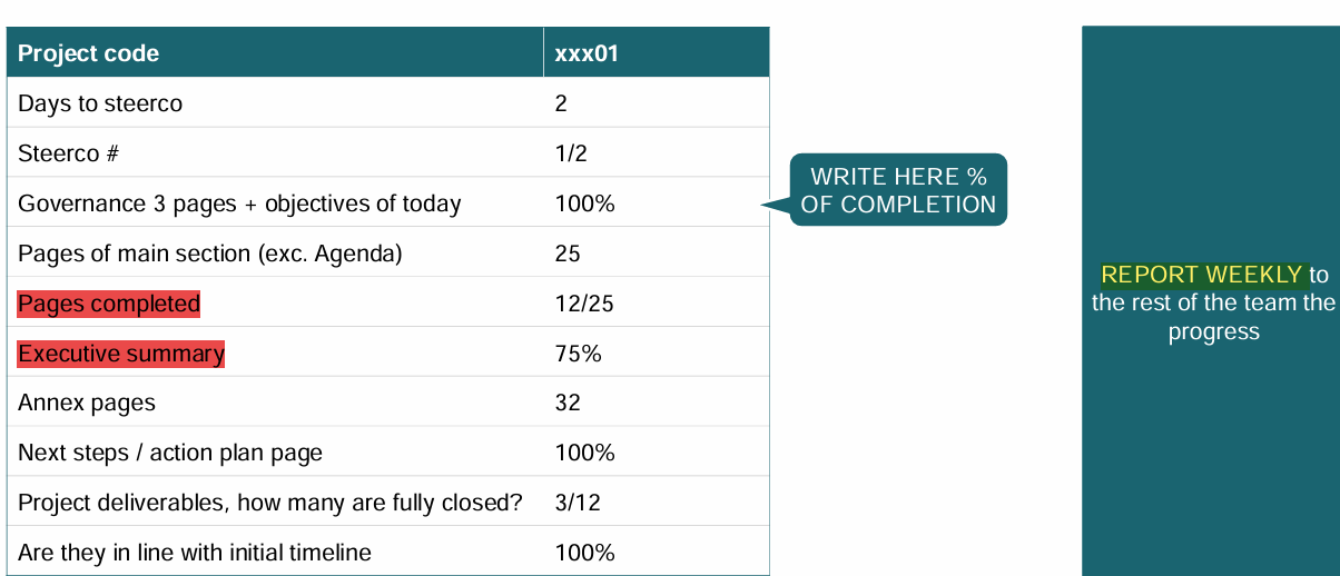 What is the weekly update of steerco deck, to who has to be reported weekly? what does it contain?