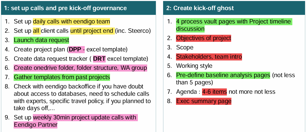 which activities should be done prior to project start so that at the end of day 1 all is in place? in particular referring to 1) set up calls and pre-kickoff governance and 2) create kick-off ghost