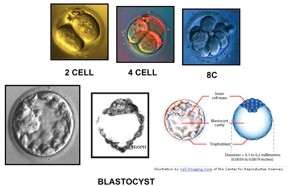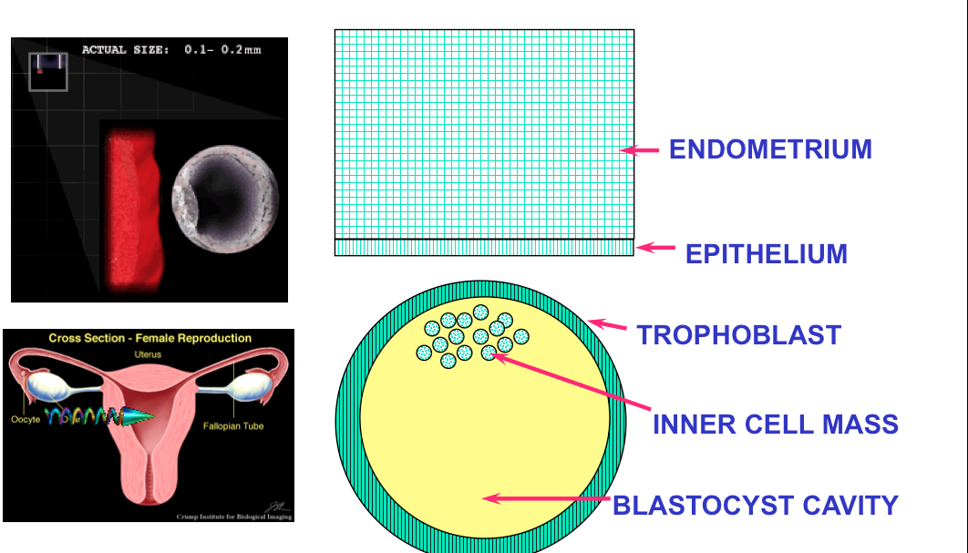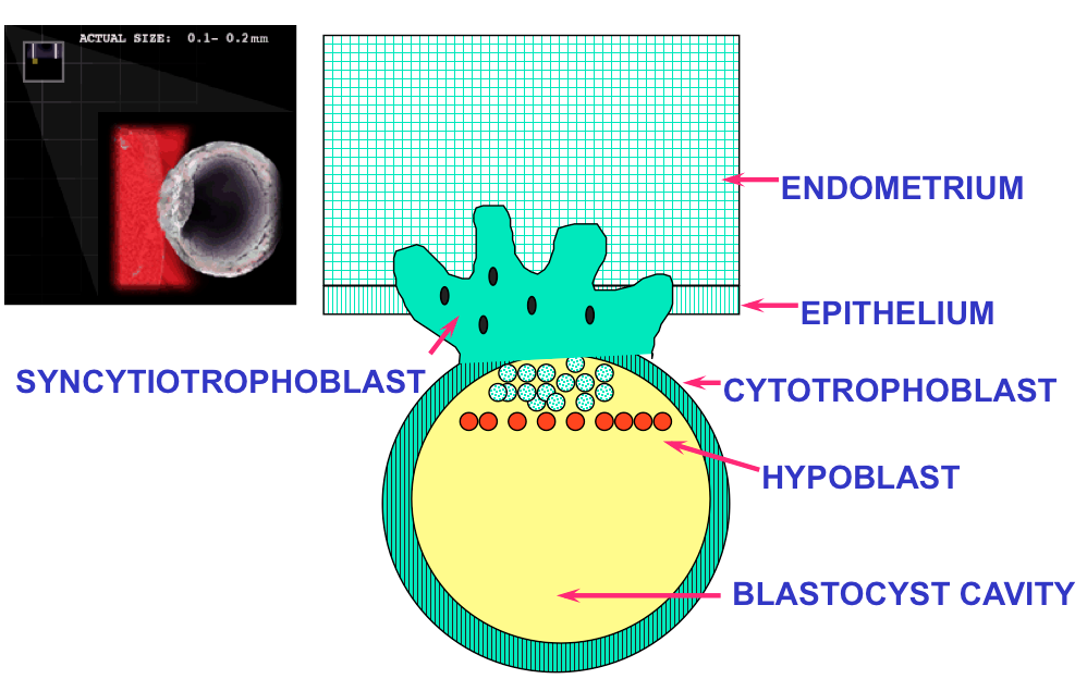 THE FINAL STAGE IS THE BLASTOCYST - NOTE TROPHOBLAST, INNER CELL MASS AND BLASTOCYST CAVITY