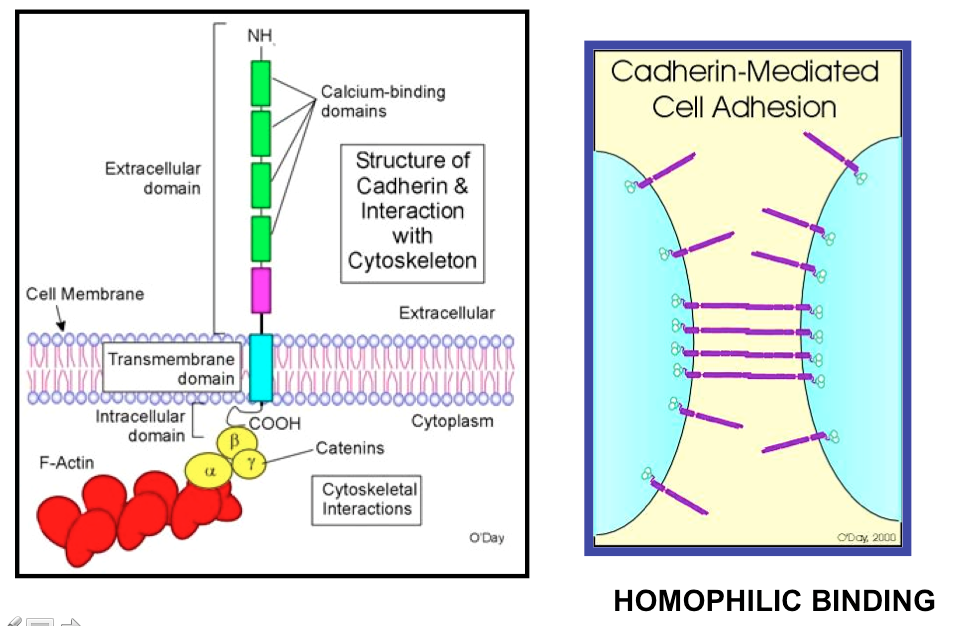 E-Cadherin is the molecule for cell to cell adhesion. Extracellular domains bind to other calhedrins. homophilic=binding where 2 protiens are the same.