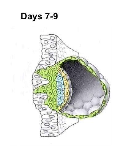 Two types of trophoblast: cytotrophoblast and syncytiotrophoblast (no plasma membranes. huge cell with many nuclei. Very invasive, fast, anchors blastocyst)