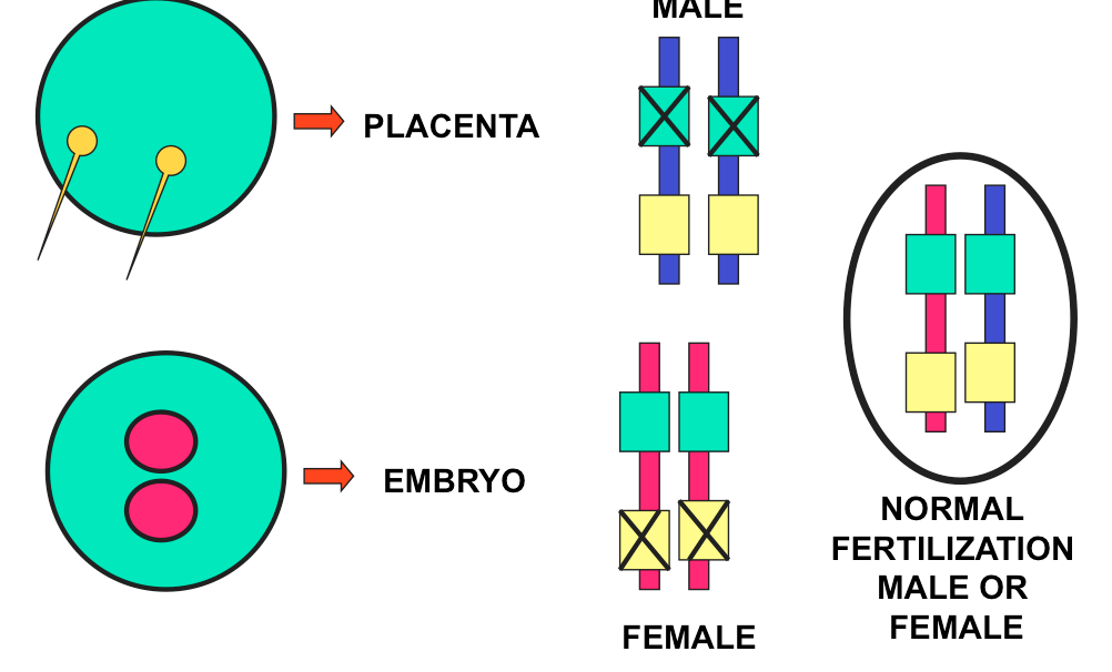IF IT GETS ALL DNA FROM ONE GENDER, SOME GENES WILL NOT WORK AND DEVELOPMENT DOES NOT GO VERY FAR