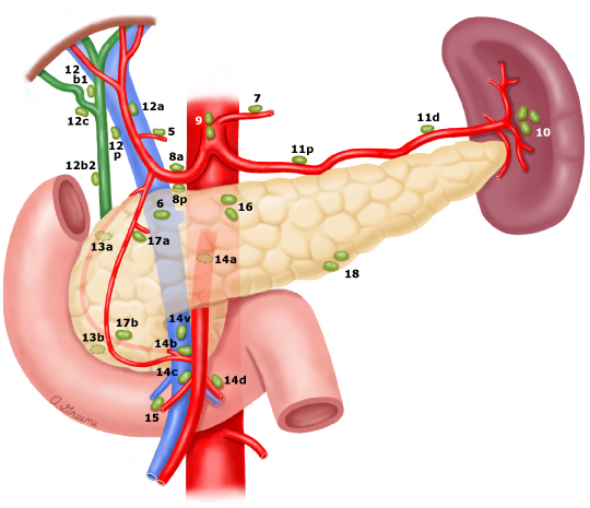 The standard regional lymph node basin for tumors located in the head and neck of the pancreas includes those along the common bile duct; common hepatic artery; portal vein; pyloric, posterior, and anterior pancreaticoduodenal arcades; and along the superior mesenteric vein and right lateral wall of the superior mesenteric artery