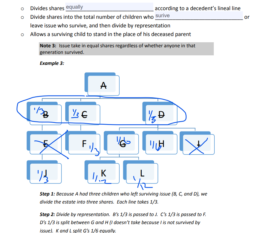 Surviving child stands in place of deceased parent. Divided equally at first generation.